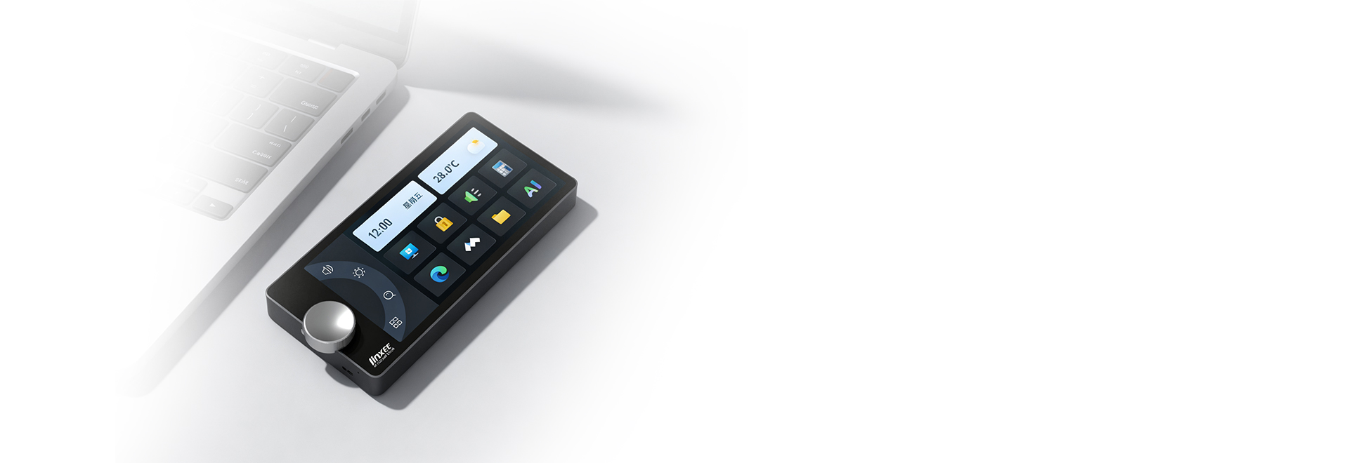 种交互模式:按键模式(旋钮调节+触摸虚拟按键)、信息显示模式(展示接口/移动硬盘/鼠标/显示器状态信息)、相框模式(照片+名言);